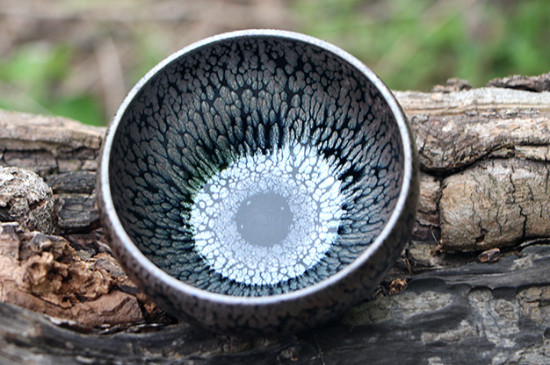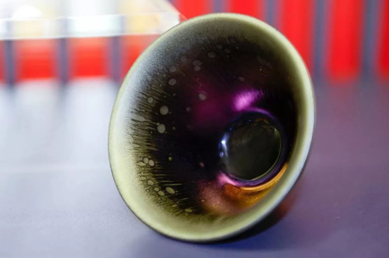 曜變盞是指在黑色的底釉上,聚集著許多不規則圓點的建盞。曜變盞上的不規則圓點被稱為曜斑,廣布于建盞的內壁上,并會隨著視角的變化發生變化,垂直觀察曜變盞時,曜斑呈藍色,斜看曜變盞時,曜斑閃金光,顯得分外閃耀。 4、油滴盞