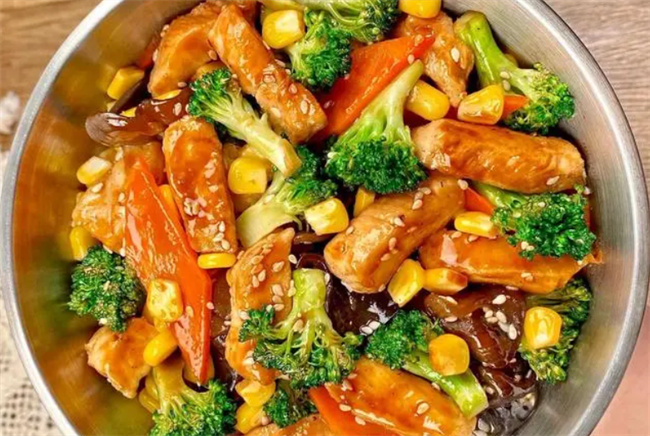 一、雞胸肉拌時蔬 主要食材: 雞胸肉、西蘭花、玉米、白芝麻、胡蘿卜、黑木耳、生抽、陳醋、黑胡椒粉、芝麻油、橄欖油、蠔油。 雞胸肉是減脂餐的經典選擇,但是可以通過改變烹飪方式,讓它變得更美味而仍然低卡高蛋白。 具體做法: 1. 將雞胸肉切成條或小塊,放入碗中。加入1勺黑胡椒粉、半勺鹽、1勺生抽,淀粉(可選),攪拌均勻,腌制10分鐘以上。 2. 在腌制雞胸肉的同時,調制涼拌醬汁。在碗中加入1勺生抽、半勺陳醋、1勺蠔油、少許橄欖油和白芝麻,攪拌均勻。 3. 燒熱鍋中的油至5成熱,將腌制好的雞胸肉煎至金黃,定型后備用。同時,將西蘭花、玉米、胡蘿卜、黑木耳等蔬菜焯水1-2分鐘,至8成熟。 4. 將煎好的雞胸肉和蔬菜混合,倒入準備好的醬汁,攪拌均勻即可享用。