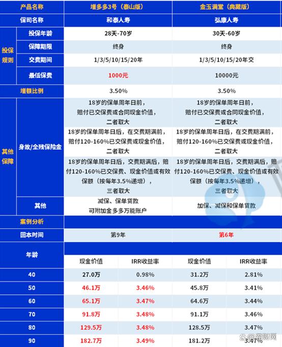 上方的兩款增額終身壽險,最高的收益率都能接近3.5%,相差不是很大。不過二者在回本時間上卻有不小差別。一個30歲的女性,按照5年交、每年交5萬的繳費方式,買增多多3號(泰山版)這款需要9年的時間才能回本,另一款只需要6年就能回本。(www.ws46.Com)
