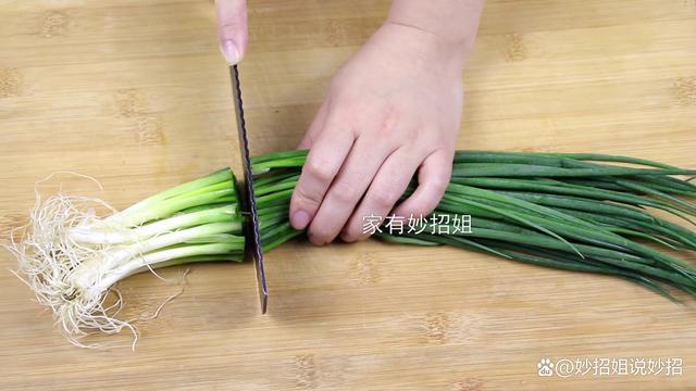 水分晾干后,我們把香蔥收起來放在案板上,然后將根須切掉不要,剩下的蔥白和蔥綠按照平時使用的大小,都切成小段的。在切香蔥的過程中,氣味會比較嗆鼻,我們可以在切之前先戴個口罩,就能避免這個問題了。