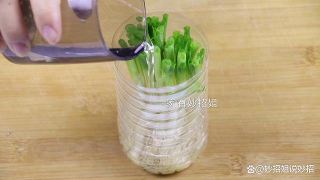 香蔥切好,我們再拿個塑料瓶,將瓶子從中間剪開,留下瓶底大概十厘米的樣子。接下來,只需將蔥白的根部直接放進塑料瓶中就可以。 然后往瓶中接入清水,水的量沒過香蔥的根部。最后,我們只要將它放在廚房的窗臺,過上兩三天,它就會慢慢的長出新芽。期間我們一兩天更換一次水,保持水的新鮮,就可以保存香蔥很長時間都不壞。