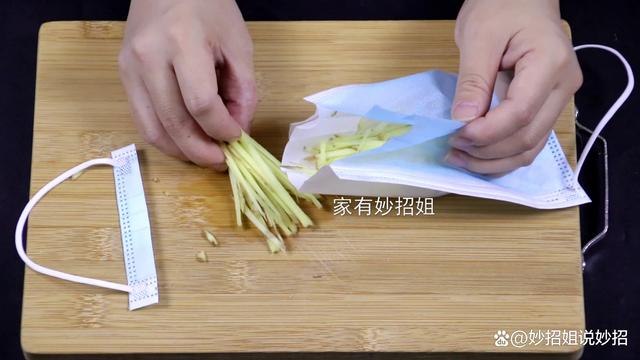 接著,再拿個一次性口罩,用剪刀先將口罩的一端剪開,扯開一層口罩布,然后將切好的生姜絲放在里面,并用剛剛剪下來的掛耳繩把口罩扎緊。這樣一個助眠的生姜口罩包就制作完成了。
