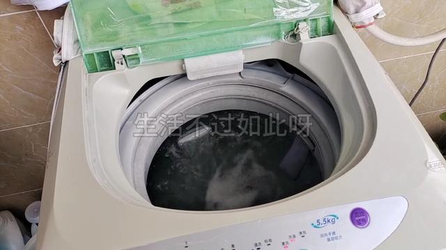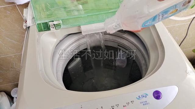 然后,在洗衣機(jī)里面加入適量的水和消毒液,
