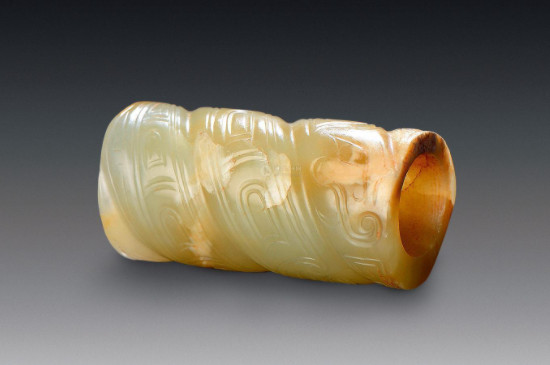 西周玉勒子的表面,有幾處黃色或褐色的沁斑,這是鐵離子元素沁入導(dǎo)致的,側(cè)光觀察西周玉勒子,可以看到這些沁斑也在表面的包漿之下。 |