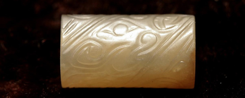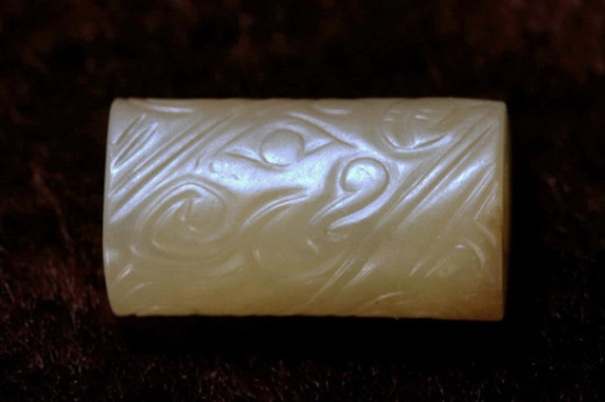 西周玉勒子經(jīng)歷了歲月的洗禮,表面光澤自然柔和,在內(nèi)部還能看見白色的絮狀飯糝。其次用用放大鏡仔細(xì)觀察西周玉勒子,能看到其表面有著縱橫交錯(cuò)的拋光痕跡。另外西周玉勒子的表面,有幾處鐵離子元素沁入導(dǎo)致的黃色或褐色沁斑。 1、光澤