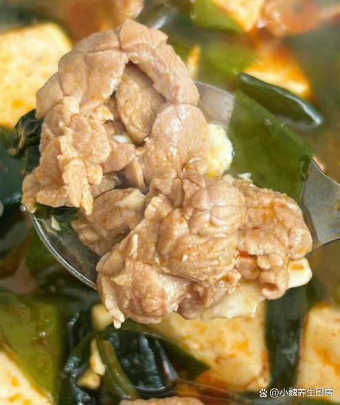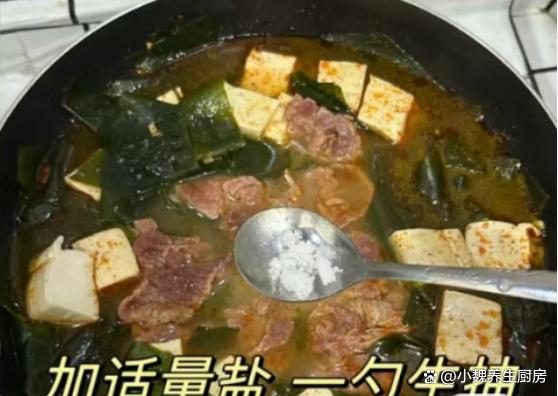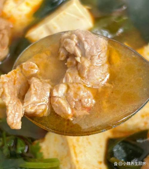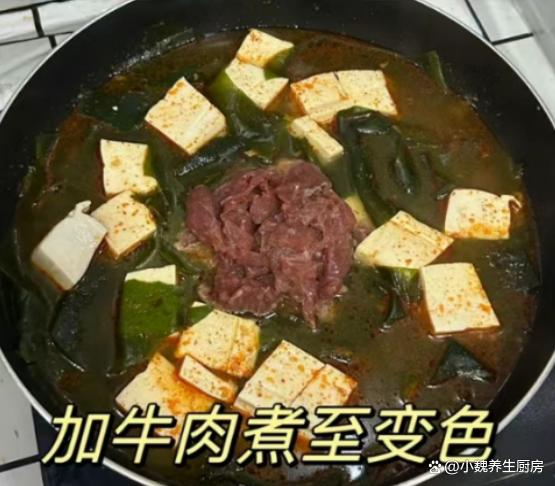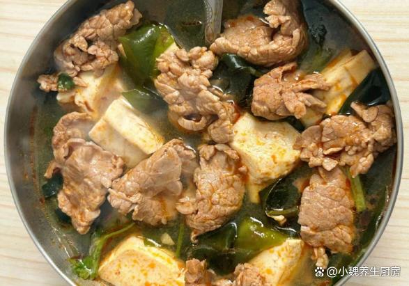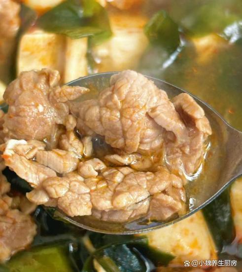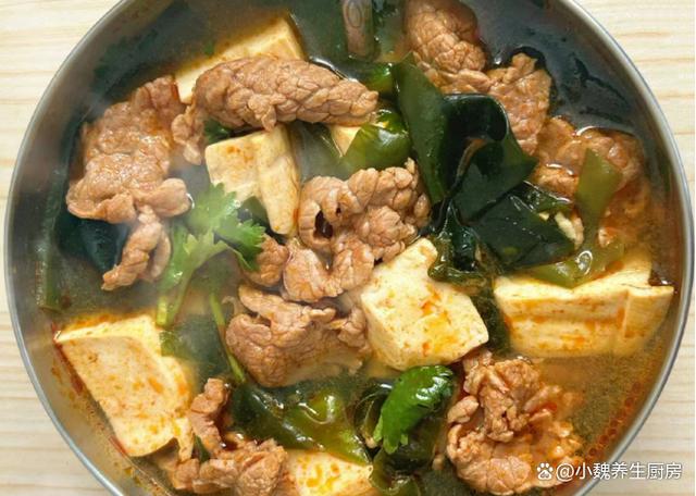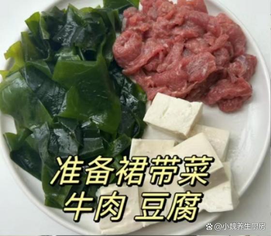 進入十月份以后,天氣越來越寒冷了,早上都是霧氣蒙蒙的,晚上都是陰冷潮濕,早晚溫差越來越大,我們要穿上厚一些的衣服,避免著涼了。秋季是一年中最舒服的時候,我們的食欲會很差,孩子和老公都不愛吃飯。今天給家里人制作一道家常菜肴——裙帶菜牛肉豆腐湯,做法特別簡單,營養又解饞,不懂吃怪可惜。秋季轉涼,無論多忙,多給家人吃“它”,解饞開胃,天天吃不會膩。  【裙帶菜牛肉豆腐湯的正確做法】 準備一些食材:挑選優質裙帶菜80克(裙帶菜又叫海菜或者發菜,是一種非常鮮嫩的海藻,主要生長在淺海區域,因為其像裙帶而得名,許多南方人用來煮湯,湯里富含鈣質,蛋白質和維生素成分,營養更好消化和代謝),挑選新鮮牛肉里脊一大塊(牛肉里脊牛肉里脊是肉類中的一種,它來自于牛的肌肉群,具有鮮嫩的口感和豐富的營養價值,烹飪方法非常多,牛肉里脊肉質細膩、味道鮮美,可以用來制作各種美食,受到很多人的喜歡),豆腐一塊,辣椒面少許,清水適量,生抽和老抽少許,食鹽少許,雞精半勺,其他佐料。