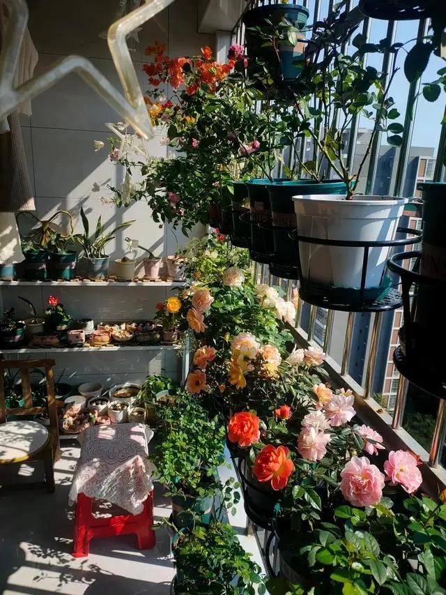 河南小姐姐,在7㎡陽臺上種滿了月季來自河南的小姑娘,是一名在讀碩士的女生,她很喜歡月季花,但以前都是在學校里,不太會種花,后來大學畢業,拿到了碩士學位,一個人租了一套房子,這才實現了自己的夢想。 小姑娘選的是朝南的小陽臺,一天能有4到6個小時的陽光照射,最重要的是,房東還在陽臺上裝了窗戶,滿足了小姑娘想要打造一堵“月季墻”的愿望。 在架子上,她的月季花有四層,大概有五十多個,開到最盛的時候,簡直就像是一堵花墻,美輪美奐,讓她有一種多年沒有種過的感覺。