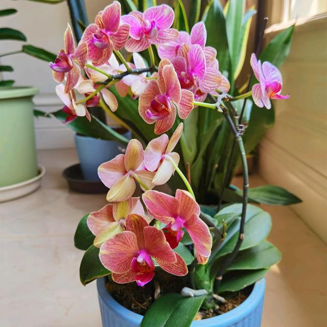 八、蝴蝶蘭 有“洋蘭王后”之稱的蝴蝶蘭,其花開如蝶,美麗動(dòng)人,在中國(guó)農(nóng)歷新年期間,更增加了喜慶的氣氛。 許多朋友覺(jué)得蝶蘭不好養(yǎng),其實(shí)我覺(jué)得,蝶蘭屬于“懶人花卉”,適宜在15-20℃光照充足的地方種植,日常盆土不要太干,要澆水,要澆水,天氣干燥的時(shí)候,要多噴水,要保持濕潤(rùn),每月用一次蘭花專用肥,開花前改施磷酸二氫鉀,可促進(jìn)其多開花。