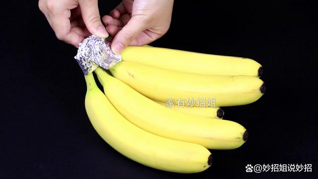 接著,我們再用紙巾或毛巾,把香蕉表面的水分擦干,因為水汽也會加快香蕉的變質。接下來,我們再準備一塊錫箔紙,用錫箔紙將香蕉的根部包裹起來,如果香蕉的根部已經變黑開始腐爛的話,要記得先將它切掉一點。香蕉的根部會釋放一種乙烯氣體,這種氣體就是香蕉本身的催熟劑,我們把它包裹起來后,就能阻止催熟氣體的釋放,也就能延長香蕉的保存時間了。