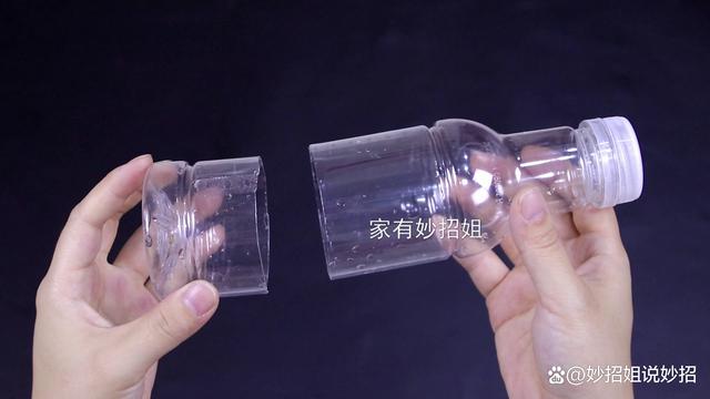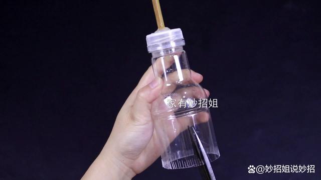 膠布纏繞好,兩根筷子就處理好了,接下來,我們再把塑料瓶改造一下。這個塑料瓶就是平時我們喝飲料的瓶子就可以,但最好選擇材質更硬一些的,它的效果會更好。我們用剪刀將瓶底2/3的位置剪一圈,將塑料瓶剪成兩部分。瓶底的部分就不需要了,只需要用到瓶子的上半部分。