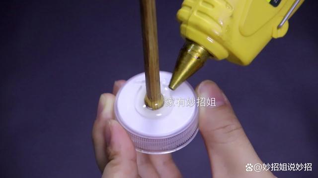 下一步我們將塑料瓶的蓋子取下,然后用剪刀或電烙鐵在瓶蓋的中間戳上一個洞,洞的大小能伸入一根筷子就可以。洞戳好,我們把剛剛連接起來的兩根筷子插入這個洞中,周圍用熱熔膠固定。