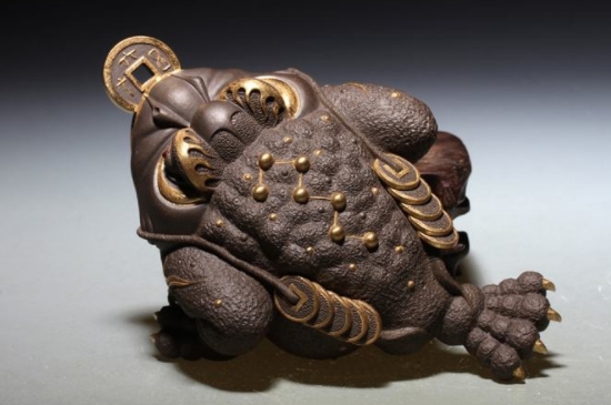 還有一類金蟾,口含錢財,背上也背負著錢財,這類蟾蜍往往被供奉在一個盛著水的盤子里,水汽不斷,財富也就不斷。經典的“劉海戲金蟾”造型就是這樣,但是這類金蟾的擺放也有要求,它同樣不能頭朝門窗擺放,這樣會把錢財都吐出去,應該向著臥室擺放,這樣吐出來的財富才能被保住,不被流失。無論是哪一類金蟾,擺放時都不應高過頭頂,這樣會為主人帶來不利。