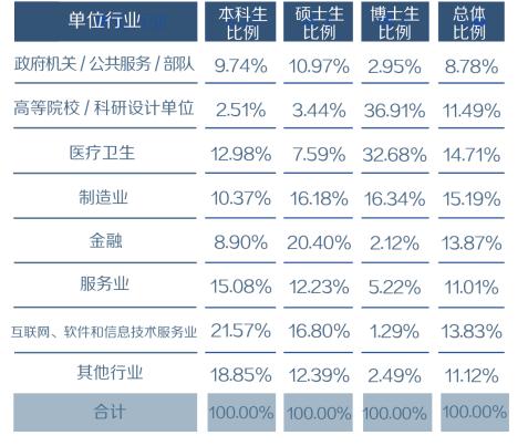 再來(lái)看就業(yè)單位行業(yè),政府機(jī)關(guān)、公共服務(wù)、部隊(duì)、高等院校、科研設(shè)計(jì)單位、醫(yī)療衛(wèi)生、制造業(yè)、金融、服務(wù)業(yè)、互聯(lián)網(wǎng)、信息和軟件服務(wù)等行業(yè)都有涉及。看來(lái)大家真的是八仙過(guò)海各顯神通啊,行業(yè)覆蓋范圍也是廣得沒(méi)邊了!