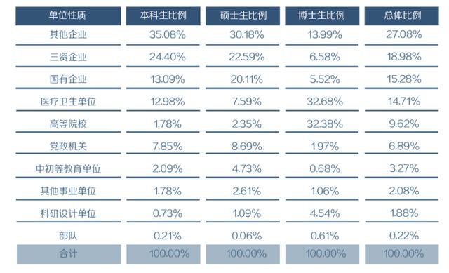 看看這就業(yè)單位性質(zhì),有61.34%的畢業(yè)生選擇在各類企業(yè)就業(yè),國(guó)有企業(yè)、三資企業(yè)和其他企業(yè)各占一定的比例。剩下的畢業(yè)生則分布在醫(yī)療衛(wèi)生單位、高等院校、科研設(shè)計(jì)單位、黨政機(jī)關(guān)、中初等教育單位等地方。看來(lái)大家的選擇還是很多的啊!
