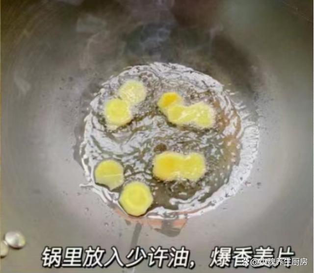 6:黨參用清水洗凈,鍋中加上適量食用油,放入一些生姜片爆香,倒入處理好的豬肚,快速翻炒一會兒,加上白胡椒碎,迅速翻炒片刻。