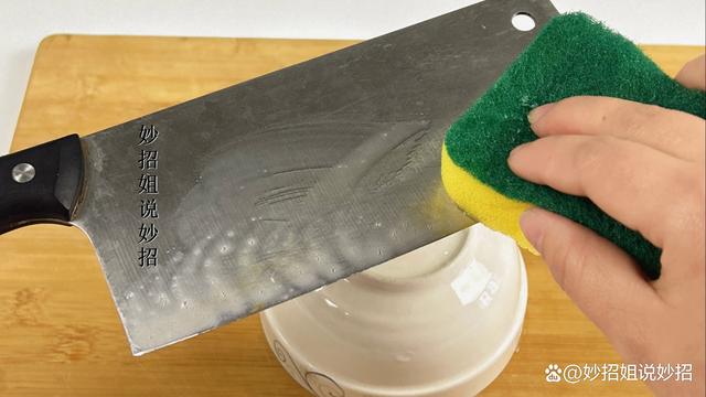 接下來,用一塊百潔布沾取這個自制的溶液,涂在菜刀的刀刃上。