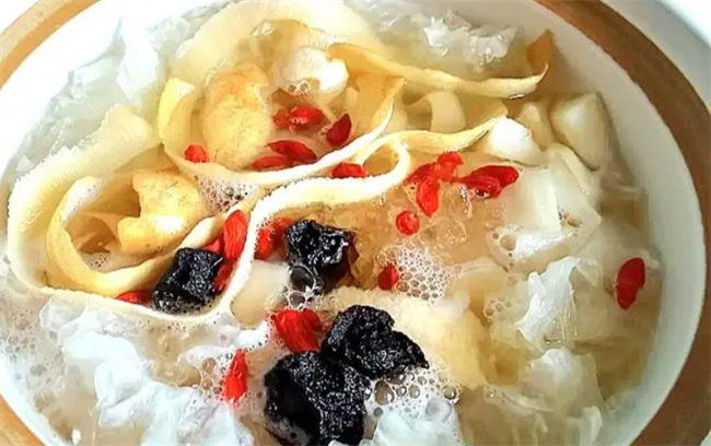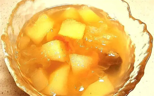 小吊梨湯的制作步驟: 1. 將銀耳洗凈、切塊。 2. 用鹽搓洗干凈生梨,將其切塊,保留梨皮。 3. 在半鍋冷水中加熱至開沸,加入銀耳,熄火燜煮十分鐘。 4. 再次加熱,加入梨塊、梨皮、35克冰糖、話梅和枸杞,煮開后轉小火繼續煮半小時。 5.撒上蔥花,攪拌均勻即可。