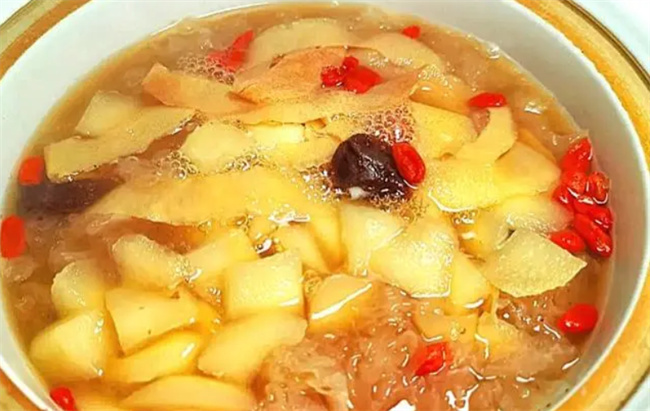 小吊梨湯的主要原料是梨子,搭配了銀耳、話梅、枸杞和紅棗等,這道湯清甜可口,具有滋陰養肺、潤燥止咳的功效。梨子是一種天然的潤肺食品,富含水分和多種維生素,有助于補充體內水分,增強肺部的潤滑功能,防止肺部干燥。銀耳則被譽為滋陰養顏的中藥材,它能清熱潤肺,有助于改善咳嗽和咽干等不適癥狀。此外,枸杞和紅棗也是中醫常用的食材,它們具有滋陰養血、調理氣血不足的作用。枸杞中的抗氧化劑和維生素C有助于促進肺部的代謝和排毒,而紅棗則可以補充氣血,提高免疫力。