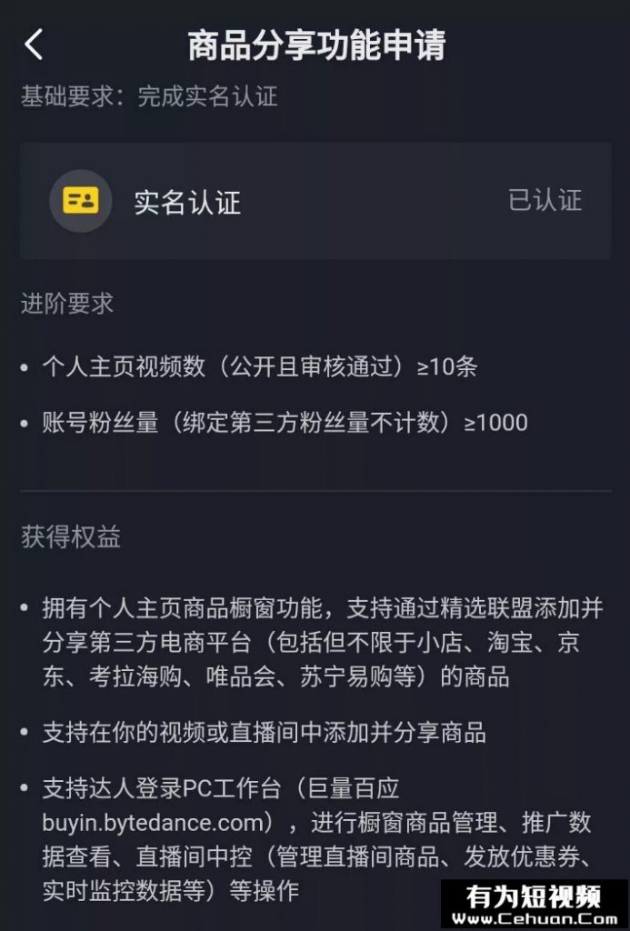 同時滿足以上三個條件后,就可以直接申請開通商品分享權限,進行抖音短視頻帶貨了。