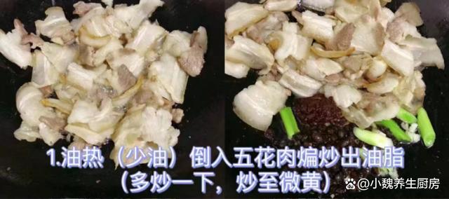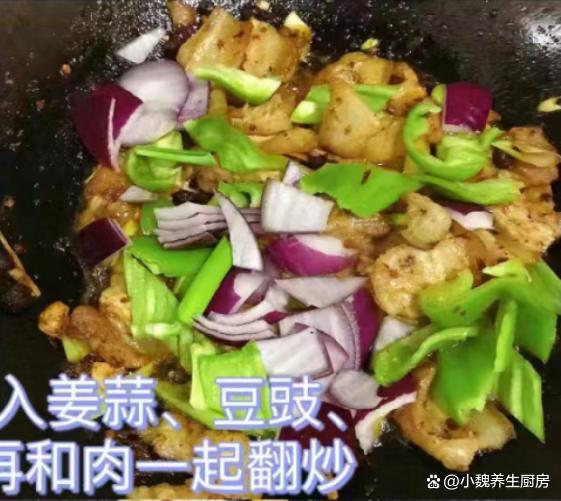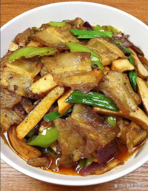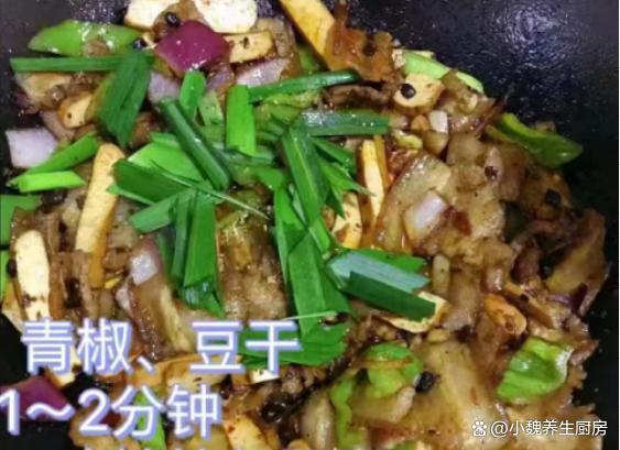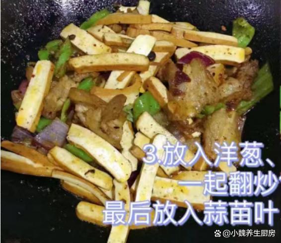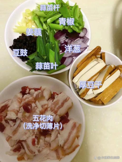 秋天已經(jīng)來(lái)臨,到了今年9月下旬,炎熱的日子就結(jié)束了,正式邁入到一個(gè)新的階段,氣溫呈現(xiàn)斷崖式下降,尤其是很多中部地區(qū),溫度到了15攝氏度以下,感覺到一秒入秋,我們都開始穿上厚衣服了。明日就是秋分節(jié)氣了,是秋季的第四個(gè)節(jié)氣,過了這天之后,晝夜開始平分,夜晚會(huì)特別冷,白天特別干燥,天氣的變化會(huì)影響我們的胃口。我們家里孩子嘴巴很挑剔,老公也缺少下飯菜和下酒菜,今天給家里人制作一道開胃菜肴——蒜苗香干炒五花肉,出鍋后香噴噴,開胃下飯,趕快給家里人露一手吧。明日秋分,無(wú)論多忙,常給家人吃這菜,順應(yīng)時(shí)節(jié),內(nèi)行人經(jīng)常吃。  【蒜苗香干炒五花肉的食譜解析】 食材清單:選購(gòu)新鮮五花肉320克(五花肉是豬肉最受歡迎的部位,許多人覺得太油膩,其實(shí)吃起來(lái)香噴噴,解饞開胃,可以搭配許多食材一起吃),冷水少許,新鮮青蒜苗幾根,大蔥半根,少許料酒,姜片若干片,半個(gè)洋蔥,青椒幾個(gè),一小勺紅油豆瓣醬,食用油若干,攸縣香干150克左右,若干個(gè)大蒜頭,雞精半勺,生抽和蠔油半勺,胡椒粉和食鹽少許,豆豉20克,其他調(diào)味品。 詳細(xì)制作順序: 1:提前選購(gòu)好青蒜苗,香干,五花肉和其他配菜,先把青蒜苗的黃葉和根須切掉,反復(fù)清洗干凈,然后斜切成小段,備用。2:先把洋蔥的外皮撕掉,切成若干小塊,洗凈備用,大蒜頭去皮切成蒜末,青椒去掉瓤洗凈,切成若干小塊。3:將香干用冷水漂洗,去掉一部分的豆腥味,切成若干長(zhǎng)條,然后將其焯水處理,放在涼水浸泡,這樣口感更好,最后瀝干表面的水分。4:生姜切成細(xì)末,五花肉提前洗干凈,鍋中放入五花肉,加上冷水沒過食材,加上姜片,蔥段和料酒適量,將五花肉焯水處理,撈出溫水沖洗干凈,切成厚度相同的片狀。