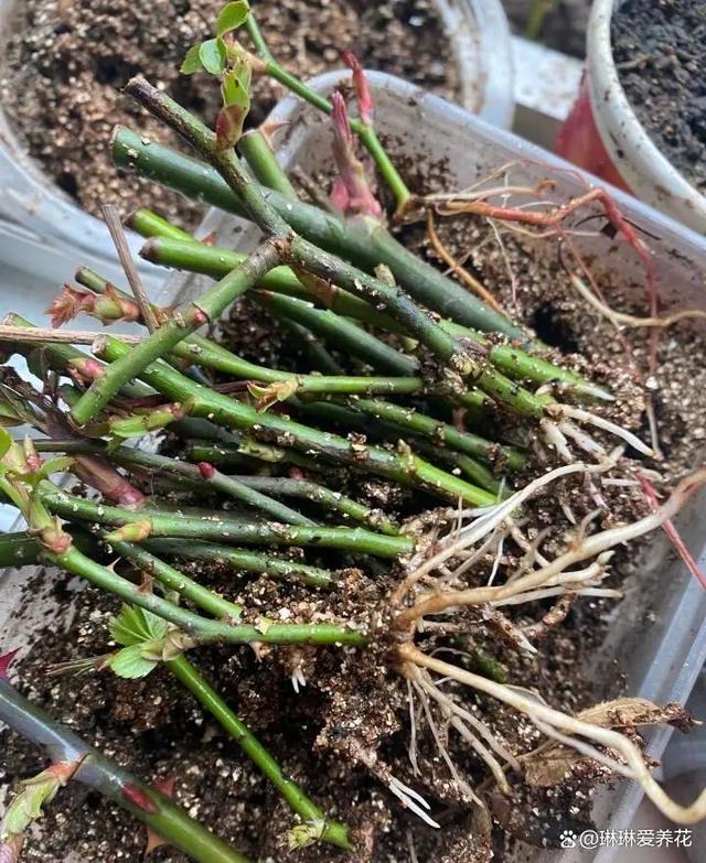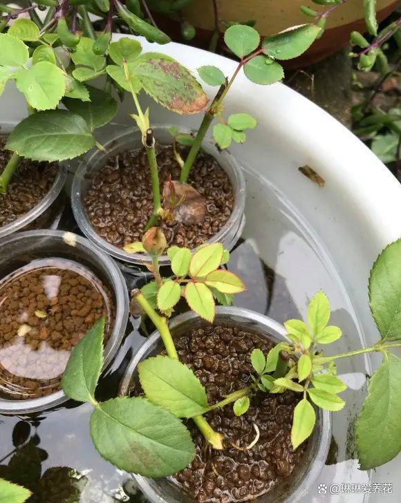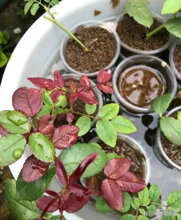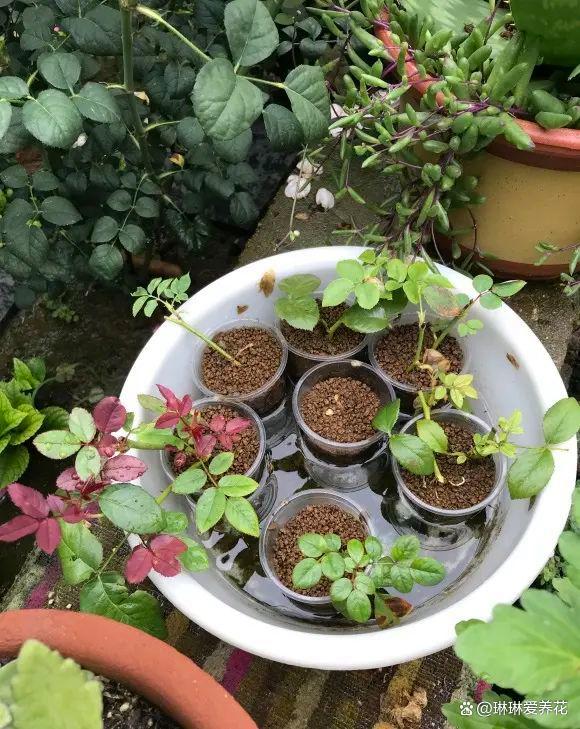 待插入盆土深度約5厘米后,保證充足的通氣性與排水性,并維持均衡的溫度與濕度。此外,選用透水性好的介質如珍珠巖、椰糠等,并配合使用塑料容器或泡沫箱作為扦插盆器,都能夠有效地提高月季插穗的成活率,如果是使用花盆或者是泡沫箱作為扦插的盆器,外層可以套上一個透明的塑料袋進行保濕。