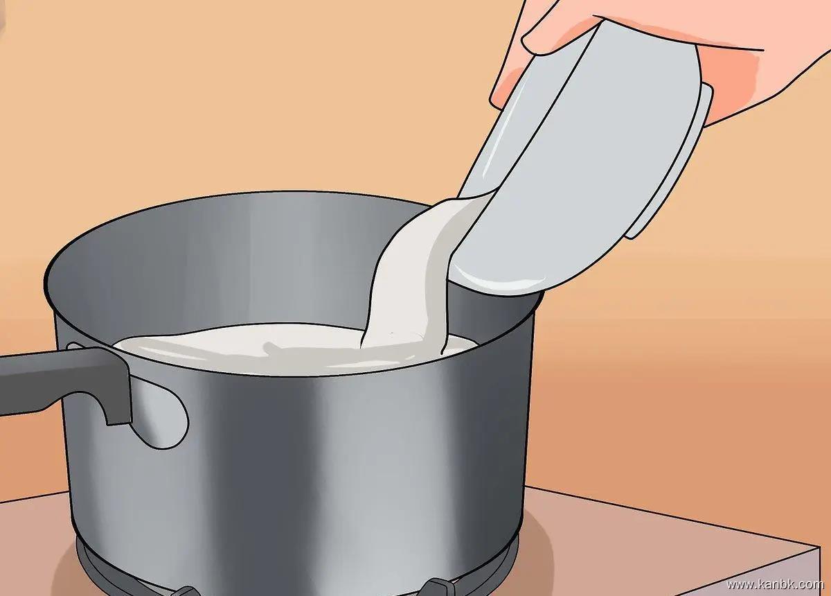 使用勺子將椰子乳舀起放入鍋中,加熱至沸騰,然后調低火,持續慢慢地攪拌。