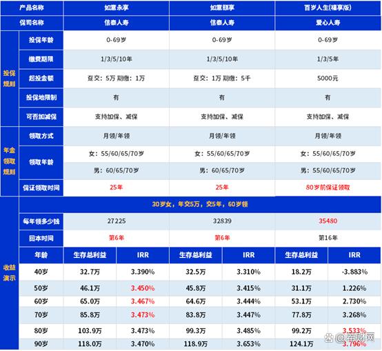 哪些產(chǎn)品可以替代增額終身壽險(xiǎn)?首先,就是養(yǎng)老型年金險(xiǎn)。養(yǎng)老型年金險(xiǎn)的特點(diǎn),就是在達(dá)到一定年齡之后,可以每年或每月穩(wěn)定的領(lǐng)取一筆年金,同樣可以保障長(zhǎng)期收益的穩(wěn)定。比如下方的幾款養(yǎng)老年金險(xiǎn):