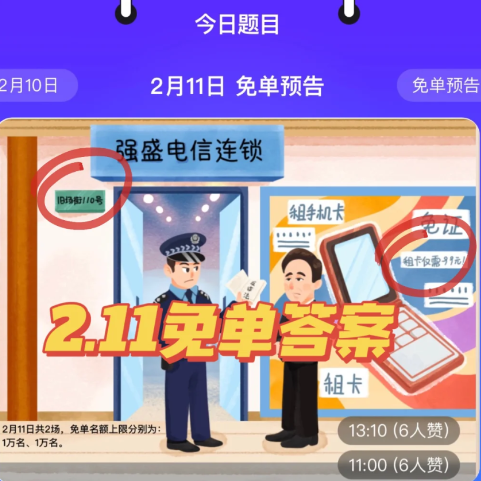 2月11日餓了么免單答案最新【答案猜想】提示排除 思路一 概率小,重點在反詐 9:09或者21:09,11:00或者13:10 根據圖片數字舊場街110號,租卡9.9元 思路二 9:06或者21:06,11:00或者13:10 根據反詐電話 96110 思路三 12:01,17:31 反詐法是2022年12月1日有的 反詐法第五章第三十一條涉及出租電話卡 準確答案和秒數排名會置頂在評論區?? 【場次時間】共2W名額 第一場,名額1W,建議≤6秒 第二場,名額1W,建議≤6秒 保守推測,也有超出時間也能免的,最近秒數比較迷