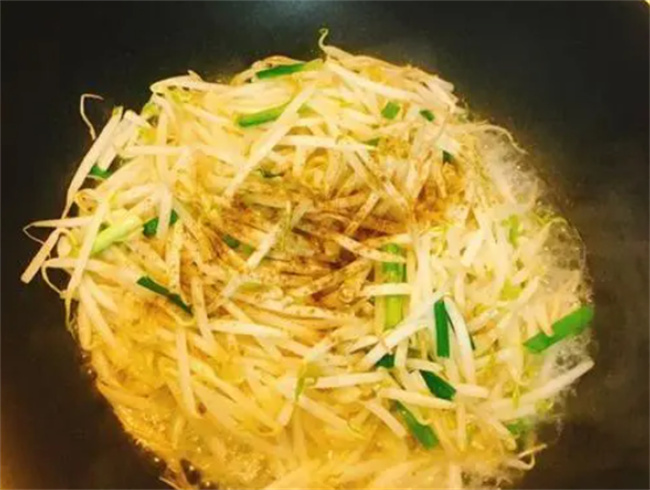 二、制作過程: 1. 拍碎蒜頭備用,將豆芽菜和韭菜洗凈備好。 2. 在熱鍋中加熱,中火,撒入少量鹽,加入蒜末。 3. 隨即放入韭菜,翻炒至散發出香氣。 4. 加入豆芽菜,繼續翻炒。 5. 倒入一杯水,翻炒后撒上適量黑胡椒粉調味。 6. 待鍋內的水滾后,悶燒片刻,即可起鍋享用。