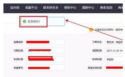 6、如果訂單發(fā)貨成功,這時會在頁面頂部顯示一個“發(fā)貨成功!”綠色字樣,也就代表此訂單發(fā)貨成功了,等待買家簽收即可。