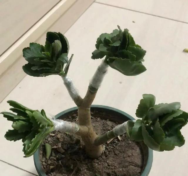 長壽花枝條與玉樹連接處,兩面的表皮去除,露出里面翠綠色的組織,長度大概是2到3厘米。處理好之后。可以在界面上涂抹少量的生根激素,這可以促進愈合,使兩者快速長在一起。 一定要讓它們的形成層充分吻合。也就是讓接穗的切面緊密地貼合到砧木的切口上,確保至少有一部分接觸面緊密結合。使用嫁接膜或綁帶將接穗和砧木緊密地綁定在一起,確保接穗不會移動。 將嫁接后的植物放置在溫暖、明亮但不直射的地方,保持適當的水分,避免過度澆水。在接下來的幾周內,觀察嫁接部位是否愈合。如果嫁接成功,接穗會開始長出新的葉子。一旦嫁接部位完全愈合,可以小心地移除綁帶。