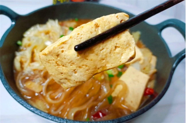 三、制作步驟: 1. 將大白菜的葉子和幫子分開處理。葉子撕成大片,而幫子則切成片狀,這樣可以更容易入味。 2. 選擇老豆腐,因?yàn)樗蝗菀灼扑椋诟懈谩⒗隙垢谐?厘米厚的片狀。將大蔥切片,姜切絲,干辣椒切段,五花肉切成薄片。將紅薯粉條用溫水浸泡20分鐘,泡軟后瀝干水分。 3. 將泡軟的紅薯粉條放入碗中,加入適量的老抽和香油,攪拌均勻,以防粘連成坨狀。 4. 鍋中加入少量油,燒熱后放入豆腐片,小火煎至表面呈現(xiàn)金黃色,口感焦脆即可,隨后盛出備用。 5. 鍋中重新加入少量油,加入五花肉片,小火煸炒,將多余的油脂炒出,這樣能減少油膩感,同時(shí)增強(qiáng)風(fēng)味。將五花肉片炸至金黃色后,加入蔥片、姜絲、干辣椒、八角、花椒,炒至香氣四溢。 6.淋入一些老抽,翻炒均勻,然后加入切好的白菜幫子,大火翻炒2分鐘,待幫子略透明后,再加入白菜葉子。 7. 繼續(xù)大火翻炒1分鐘,直到白菜葉子變軟。加入處理好的紅薯粉條,大火翻炒均勻,倒入適量的食鹽、生抽、五香粉,繼續(xù)翻炒均勻。 8. 將煎好的豆腐片擺放在燉菜上,蓋上鍋蓋,大火煮開后,轉(zhuǎn)小火燉煮10分鐘,讓食材充分吸收湯汁入味。當(dāng)湯汁逐漸變少時(shí),可以加大火力收汁,最后撒上蔥花,即可出鍋。