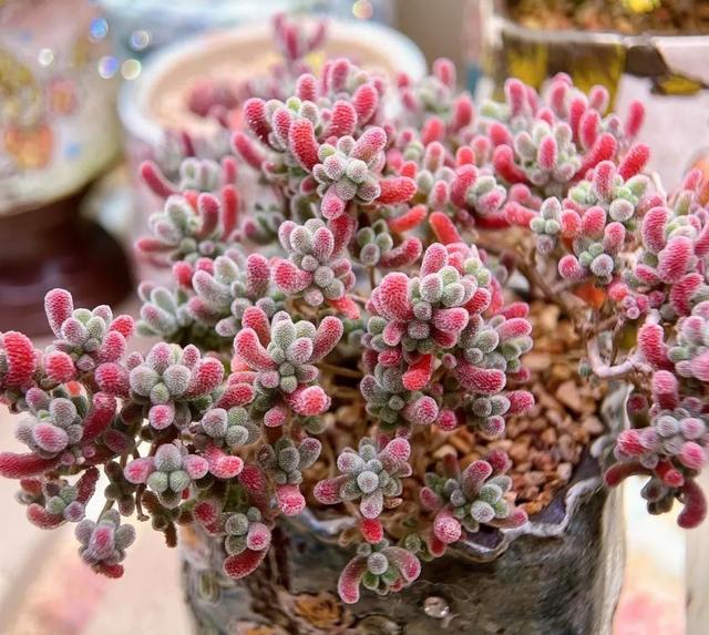 四季海棠也是一樣,葉片上的絨毛遇水不易干,時(shí)間長(zhǎng)了葉子就會(huì)黃,甚至爛掉。如果在痛風(fēng)并不是很好的情況下,水分無(wú)法蒸發(fā)掉,不僅僅是葉片腐爛,整株還容易發(fā)生死亡,雖然皮實(shí),對(duì)于這些有絨毛的植物,咱們就別給它們?cè)黾印跋丛琛钡臒懒恕Q刂ㄅ璧倪吘墸凉菜攀亲罴训难a(bǔ)充水分的方式,壽命才會(huì)更持久。 多肉植物
