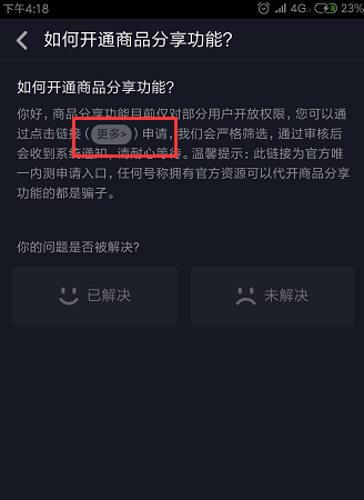 點擊“如何開通商品分享”頁面如下,很多人就被下方的紅色按鈕“意見反饋”欺騙了,應該點擊內容中的更多按鈕,這樣才能進一步去到申請頁面!