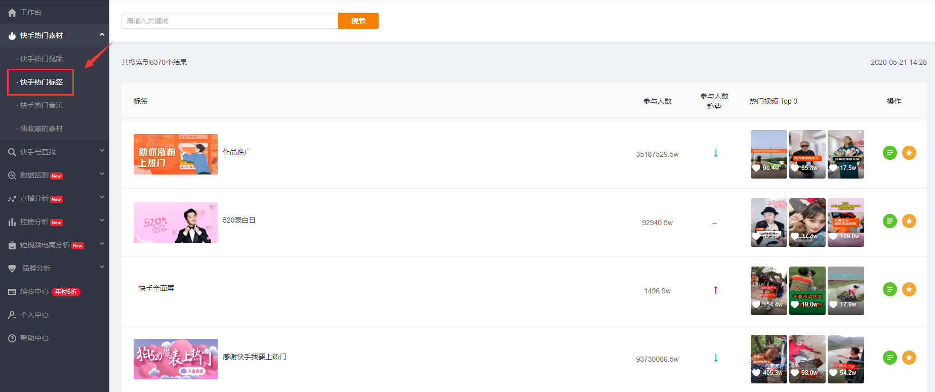 我們在發布新視頻時可以添加熱門標簽,當其他用戶在搜索標簽時,會很容易搜到我們的視頻,在一定程度增大了曝光率。注意:標簽選擇需要符合我們的領域和定位。而這里我們同樣也可以借鑒飛瓜快手的【快手熱門標簽】來選擇合適的標簽,通過飛瓜快手的【快手熱門標簽】我們可以發現最(jìn)使用人數上漲多的標簽,還能查看昨日視頻增量最高的標簽并精準篩選與視頻內容相關的熱門標簽。