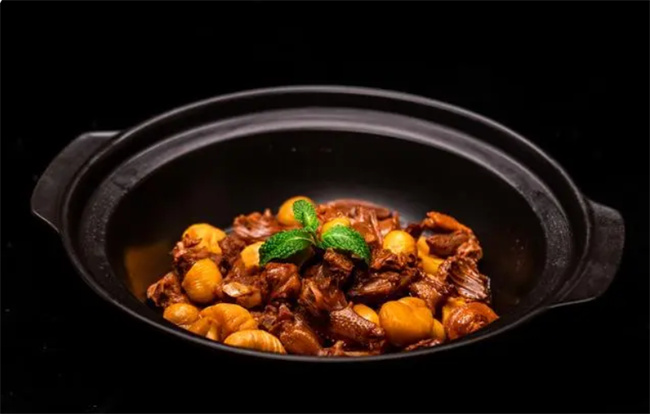 5. 加水燉煮 加入適量的水,使其能夠覆蓋住雞肉和板栗,蓋上鍋蓋,將火調至小火,開始燉煮。大約30分鐘左右的時間,能讓雞肉和板栗充分煮熟,達到軟爛的口感。 6. 調味 根據個人口味,適量添加鹽、白胡椒粉或其他調味料,調整味道使之更加協(xié)調。也可以加入一些糖或其他調味料,增添風味。 7. 出鍋裝盤 當板栗燒雞煮熟軟爛后,可出鍋裝盤。在最后的裝盤時,撒上一些蔥花或其他裝飾物,增添美感。