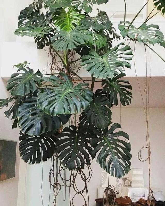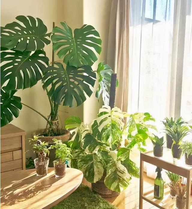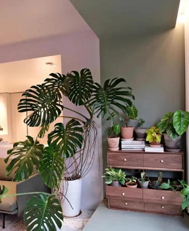 3、利用龜背竹搭配 除了龜背竹子,還有一個精致的置物架,上面和下面的架子上,擺滿了各種各樣的植物。 龜背竹很有靈性,借著從窗戶射入的散光,在這一小塊地方營造出一片生機盎然的綠色,給人一種簡約而活潑的感覺,在光影之間躍動,愈看愈沉醉。 如果你也喜歡養花,但是又覺得沒有足夠的光照,那就可以參考一下主人的小竅門,把龜背竹、綠蘿、彩葉芋、竹芋等耐陰的植物放在窗戶邊;