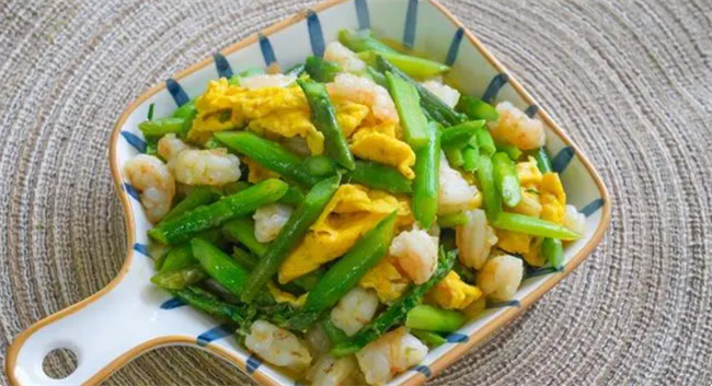 9. 蘆筍蝦仁炒雞蛋 低脂低熱量的蘆筍與蝦仁相得益彰,搭配雞蛋,呈現(xiàn)出一道清新爽口的菜肴。蝦仁腌制后炒熟,蘆筍焯水,蛋液入鍋炒熟,再加入蝦仁、蘆筍,調(diào)味翻炒,一道美味的蘆筍蝦仁炒雞蛋便成。