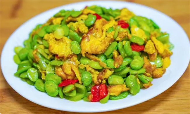 4. 蠶豆炒雞蛋 蠶豆的鮮甜搭配雞蛋的滑嫩,構(gòu)成美味的一道菜。去殼,焯水后備用。雞蛋加入調(diào)味料打散,入鍋炒熟,再加入焯水后的蠶豆,翻炒均勻,簡(jiǎn)單的蠶豆炒雞蛋便完成。