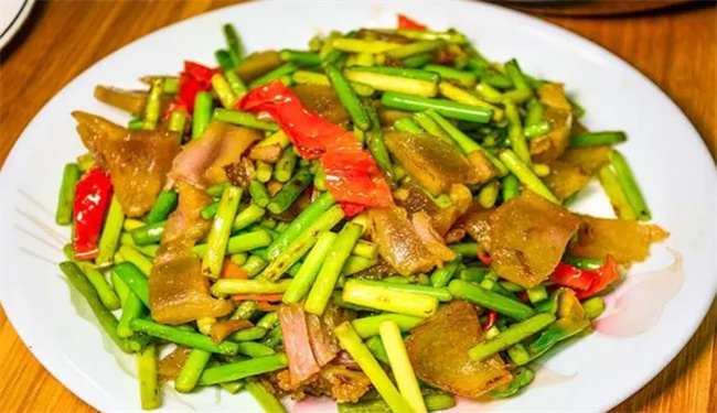 6. 蒜苔炒臘肉 臘肉的香醇與蒜苔的清香,完美地融合在一起。臘肉蒸熟切片,蒜苔焯水后炒香,再加入調(diào)味料,最后與臘肉一同翻炒均勻,一道咸香美味的蒜苔炒臘肉即可完成。