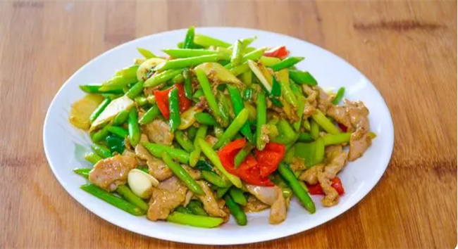 3. 蒜苔炒肉片 蒜苔炒肉片,既是美味的享受,也是素肉搭配的健康選擇。將蒜苔切段,肉片腌制入味。油熱,先爆炒肉片,盛出待用。再次油熱,加入蒜苔,翻炒后加入調(diào)味料,最后與肉片一起翻炒均勻,一道下飯的蒜苔炒肉片即可上桌。