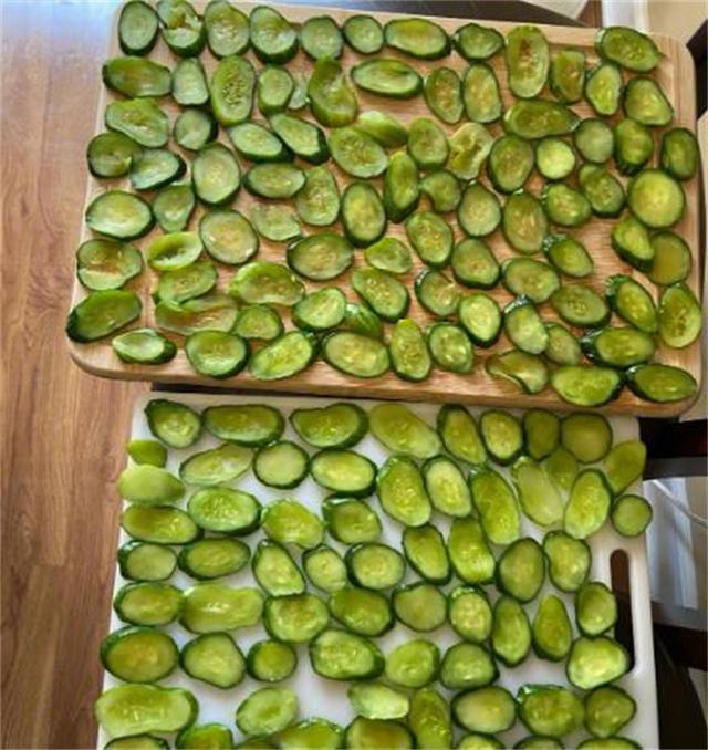 接下來,將腌制好的黃瓜片放在干凈的平板上,放到陽光下曬干。曬干的時間需要根據天氣和陽光的情況來決定,一般需要兩到三天的時間。