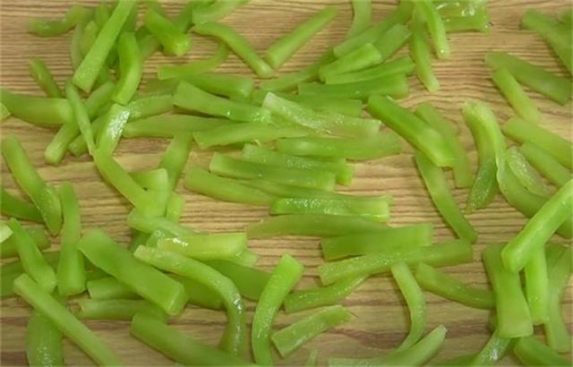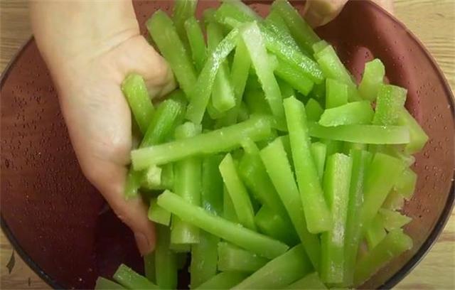 1.先把萵筍皮去掉,切成長段,切片再切成條,全部切好后放入大碗里,放上毛毛鹽,抓拌均勻以后,腌制三個小時或者一晚上都可以,殺出萵筍的水分,這是萵筍脆爽的關鍵。