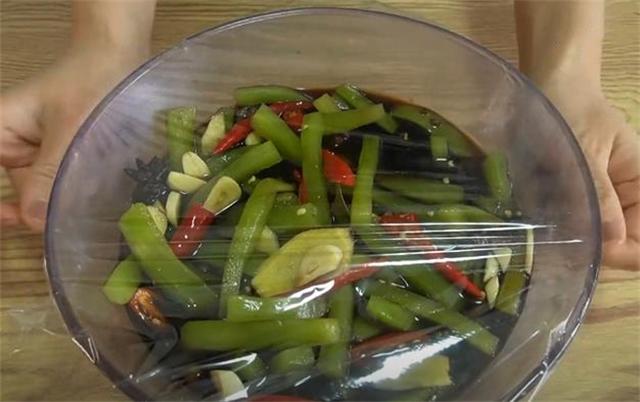 5.晾干水分的萵筍放入大碗中,放上切好的姜蒜辣椒,再倒入完全放涼的料汁,一定是完全放涼,然后蓋上保鮮膜,腌制兩個小時以后就可以吃。