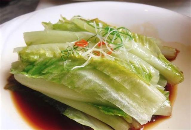 第三步是煮羅馬生菜。將水煮沸,加入適量的鹽和油,放入羅馬生菜,焯水至變綠色后撈出,用涼水沖洗,瀝干水分。 第四步是擺盤。將焯水后的羅馬生菜擺在盤子上,把調制好的白灼汁淋在生菜上即可。