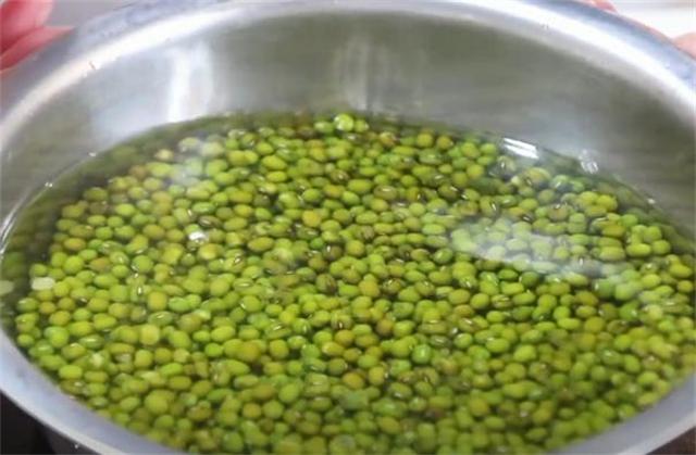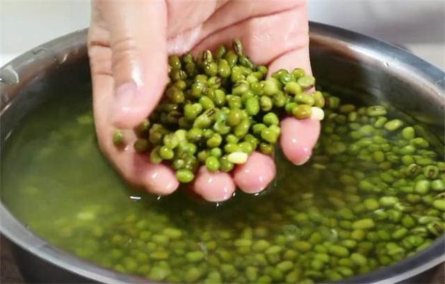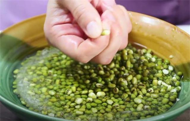 1.首先,我們把綠豆倒入碗中,進行淘洗,洗凈后將臟水倒掉。然后,加入開水并沒過綠豆,讓綠豆在這里浸泡10分鐘。