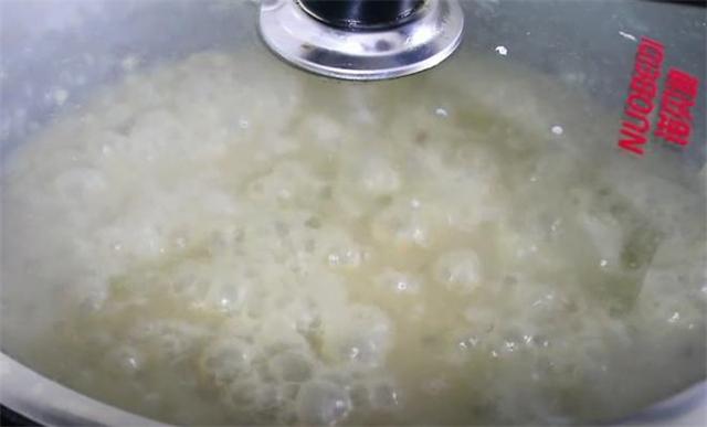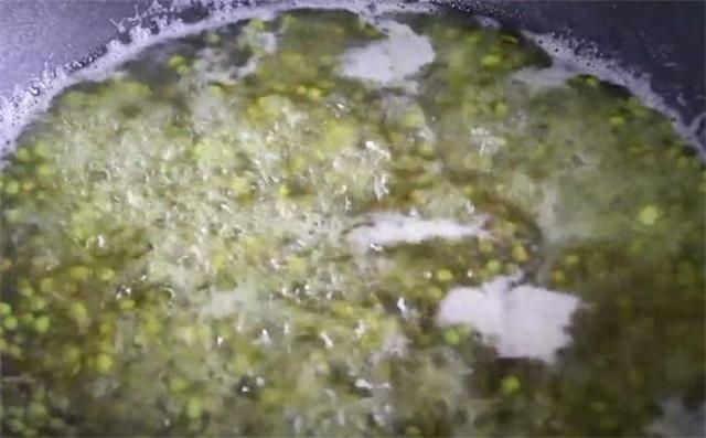 5.把鍋洗干凈,盡量沒有油,再倒點水進去,把綠豆一起放進去,家里如果有砂鍋的話,使用砂鍋效果更佳,讓它在里面慢慢加熱和融化,這里大約已經煮了5分鐘,這個綠豆都已經煮散了。