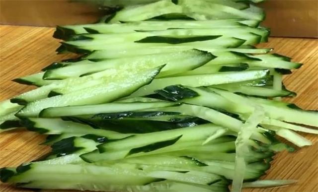 2.這會(huì)兒咱們切點(diǎn)黃瓜絲,蒜末,再切點(diǎn)香菜末備用。