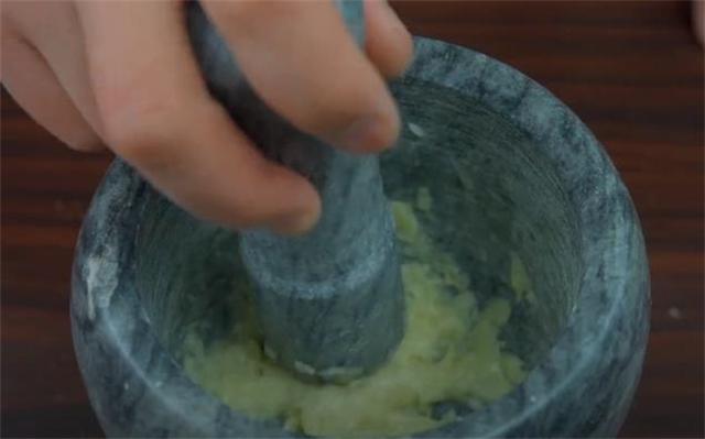 4.蒜臼里面放幾粒大蒜,加少量鹽,這樣更容易把大蒜搗碎,拌涼菜用搗蒜比用切出來的蒜末更有味道,盡可能搗細一點。