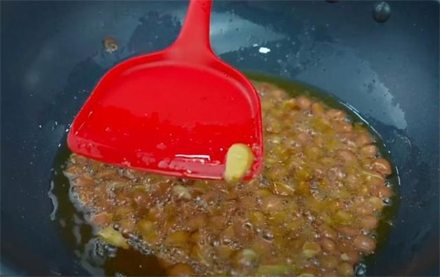 6.接下來涼油下入花生,放少量蒜片,先開中火把花生炒一下鍋,里面有小氣泡以后轉到中小火慢炸,這樣才能把花生炒透,吃起來更脆,觀察蒜片的顏色微微變黃就可以了,這個時候花生也熟了,用這個方法再也不用擔心花生會炸糊了,倒出控油。
